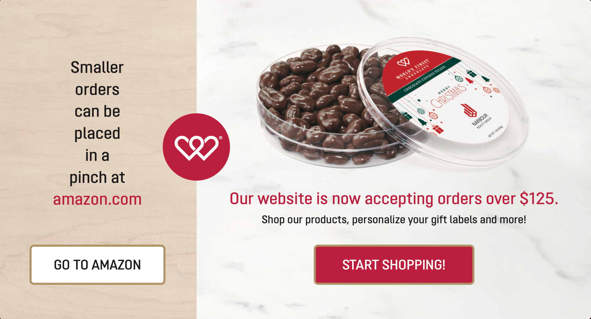 Please Note: World’s Finest® Chocolate, Inc. strives for complete satisfaction with our chocolates but cannot be held responsible for incorrect shipping addresses. Packages returned due to an incorrect shipping address will require an additional payment for reshipment. In addition, World’s Finest® Chocolate is not responsible for typographical errors on personalized labels created by the purchaser.